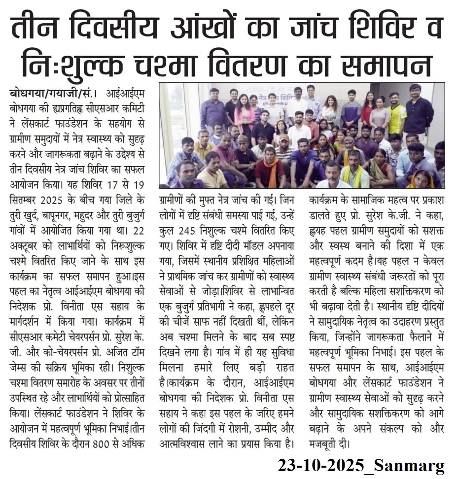 Pragati-CSR Committee, Lenskart Foundation, Free Eye Checkup Camp, Dr. Vinita S. Sahay- Director of IIM Bodh Gaya, Dr. Suresh K G- IIM Bodh Gaya, Dr.Ajith Tom James- IIM Bodh Gaya