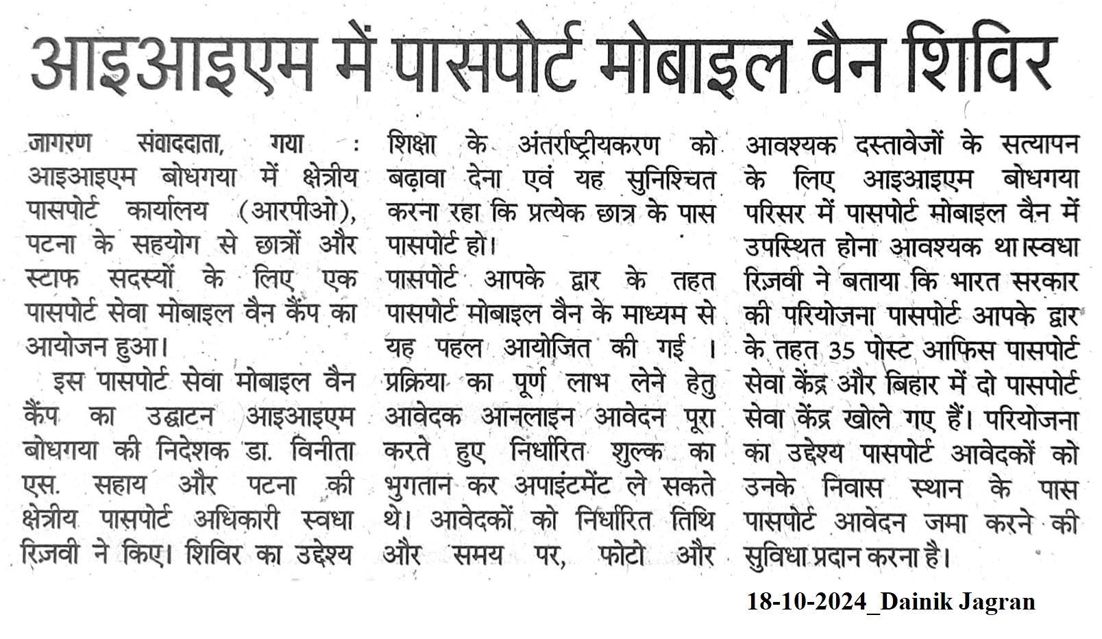 Passport Seva Mobile Van Camp, Passport Aapke Dwar, Indian Institute of Management (IIM) Bodh Gaya, Dr. Vinita S. Sahay- Director of IIM Bodh Gaya, Ms. Swadha Rizvi- Regional Passport Officer Patna