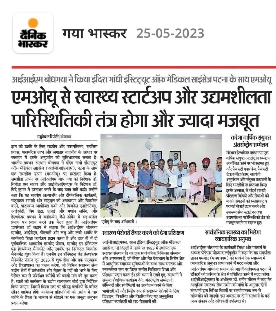 Memorandum of Understanding, MoU, Indian Institute of Management Bodh Gaya, Dr. Vinita S. Sahay- Director of IIM Bodh Gaya, Indira Gandhi Institute of Medical Science (IGIMS) Patna, Dr. Binde Kumar-Director of IGIMS Patna, IIM Bodh Gaya, IIMBG