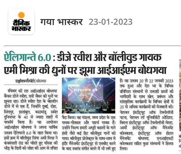 ऐलिगान्ते 6.0 : डीजे रवीश और बॉलीवुड गायक एमी मिश्रा की धुनों पर झूमा आईआईएम बोधगया