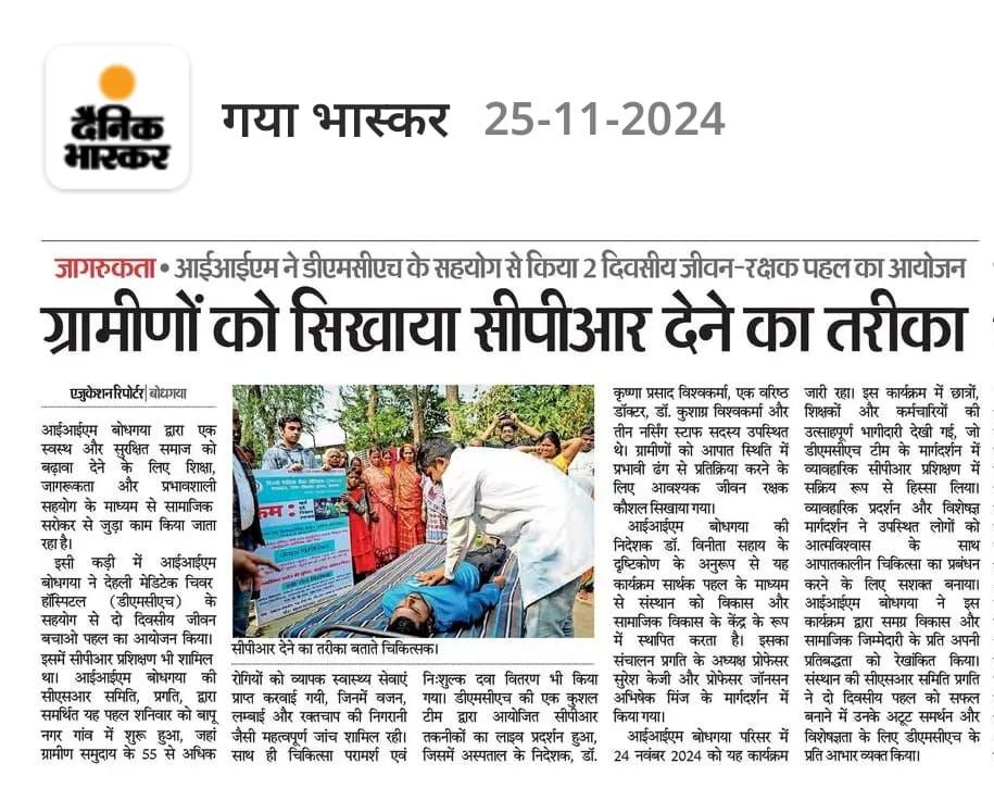 Save Life Initiative Camp, Pragati-CSR Committee, Corporate Social Responsibility Summit (CSR Summit), Dehli Meditech Chivar Hospital (DMCH), Life-Saving CPR Training and Health Camps, Dr. Krishna Prasad Vishwakarma- DMCH, Dr. Kushagra Vishwakarma- DMCH, Dr. Vinita S. Sahay- Director of IIM Bodh Gaya, Dr. Suresh K G- IIM Bodh Gaya, Dr. Johnson Abhishek Minz- IIM Bodh Gaya`