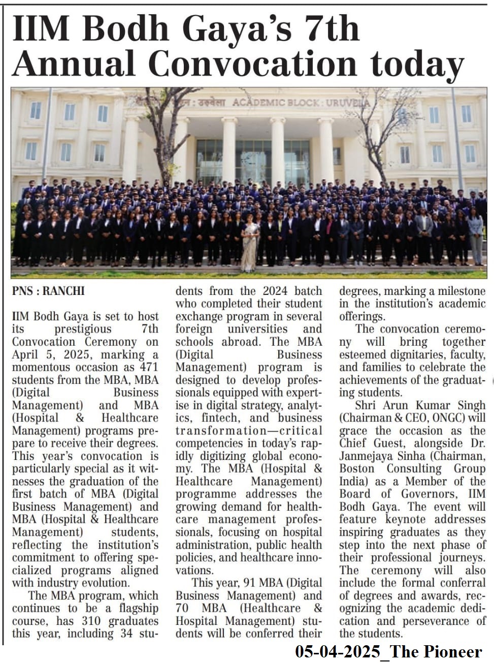 Convocation, 7th Annual Convocation, Convocation 2025, Dr. Vinita S. Sahay- Director of IIM Bodh Gaya, Dr. Janmejaya Sinha- Chairman of Boston Consulting Group (India), Mr. Arun Kumar Singh- Chairman and CEO of ONGC