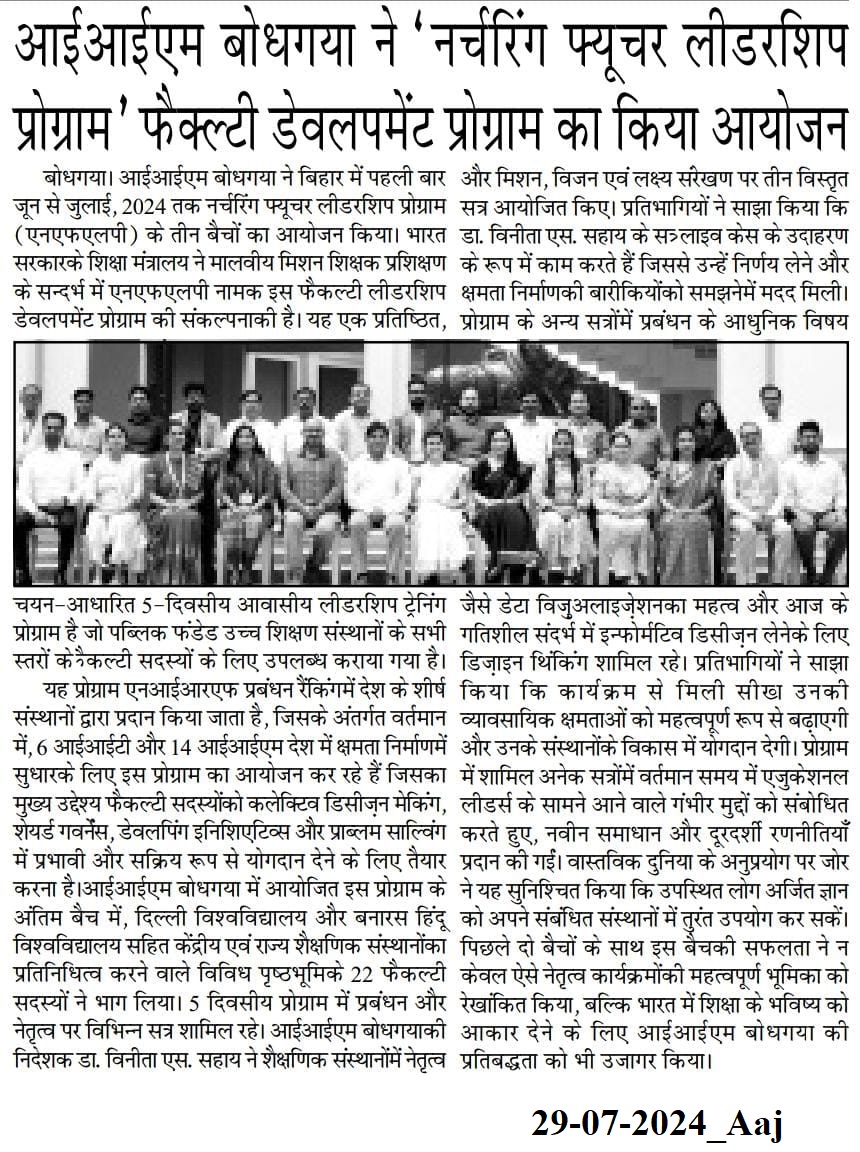 Faculty Development Programme, Faculty Leadership Development Program, Nurturing Future Leadership Programme (NFLP), Malaviya Mission Teacher Training Programme, Dr. Vinita S. Sahay- Director of IIM Bodh Gaya