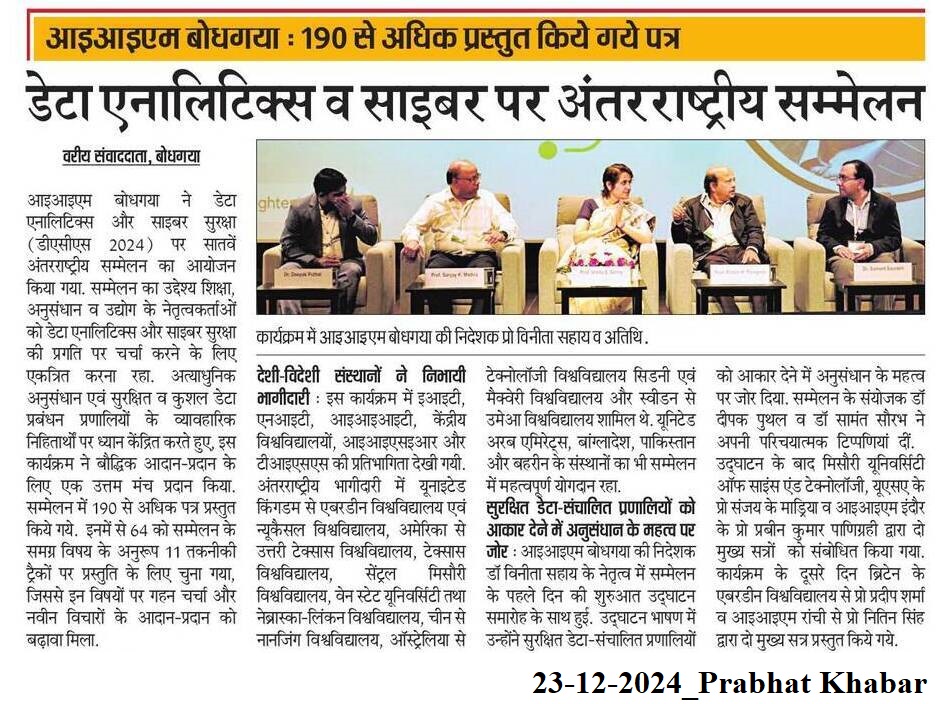 International Conference, International Conference on Data Analytics and Cyber Security, DACS 2024, Dr. Vinita S. Sahay- Director of IIM Bodh Gaya, Prof. Pradeep Sharma- University of Aberdeen- UK, Prof. Nitin Singh- IIM Ranchi, Prof. Panigrahi- IIM Indore, Dr. Madan Lal Yadav- IIM Bodh Gaya, Dr. Baudhayan Ganguly- IIM Bodh Gaya, Prof. Somnath Tripathi- IIT Patna, Prof. Prabhat Kumar- NIT Patna