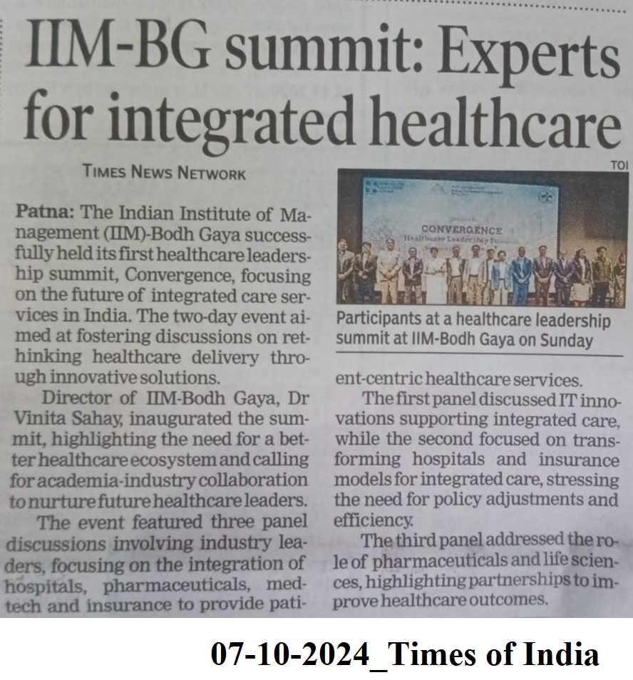 Healthcare Leadership Summit ‘Convergence 2024’, Dr. Vinita S. Sahay-Director of IIM Bodh Gaya, MBA-HHM, MBA-Hospital and Healthcare Management, Dr. Rana Mehta- Senior Partner and Leader for Healthcare at PwC, Dr. Nitin Barekere Ramachandra- Vice-President- Global HR at Omega Healthcare, Mr. Gaurav Mundra-Vice-President- Product Management at IKS Health Mr. Vikram Pawar-Country Head- Taiwan at Meril, Mr. Chhitiz Kumar- Founder of TDR Enterprises & Former Vice President of Philips Health Systems, Mr. Ranjan Pandey- CHRO at Fortis Hospitals, Dr. Gaurav Tripathi- Senior Vice-President- Health Management at Aditya Birla Health Insurance, Mr. Prem Anand K- Lead Talent Acquisition for India at Narayana Health, Mr. Sumeet Sharda-Senior Vice-President at HDFC ERGO General Insurance Company Ltd, Mr. Saji Daniel Mathew-Vice-President- Institutional Business at Agappe Diagnostics, Mr. Salil Pandey- Vice-President- Cluster Head at Sun Pharma
