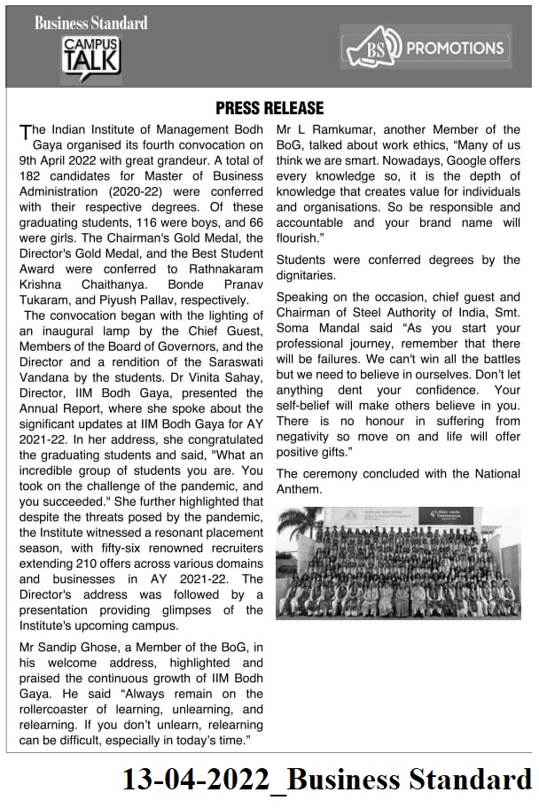 The Indian Institute of Management Bodh Gaya organised its 4th convocation on 9th April 2022