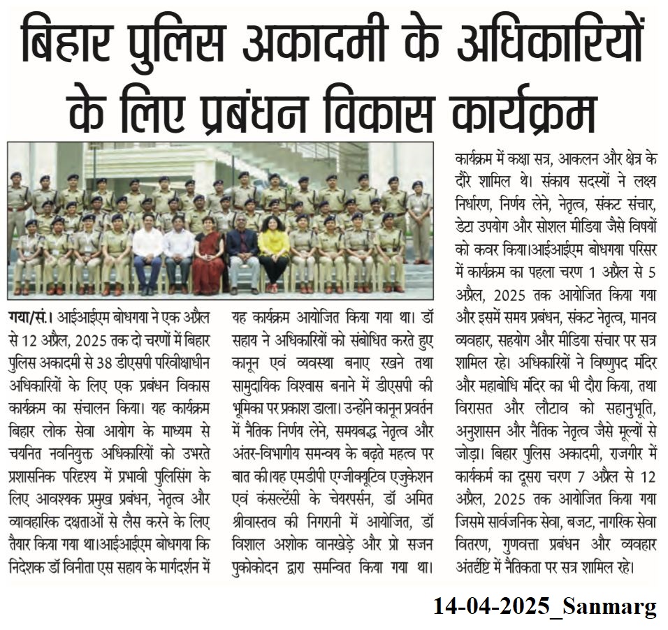Management Development Program, MDP, MDP for Bihar Police Academy Officers (DySPs), Dr. Vinita S. Sahay- Director of IIM Bodh Gaya, Dr. Amit Srivastava- IIM Bodh Gaya, Dr. Vishal Ashok Wankhede, Dr. Sajan Pookkodan- IIM Bodh Gaya, Shri Sushil Kumar- IPS- Bihar Police Academy-Rajgir
