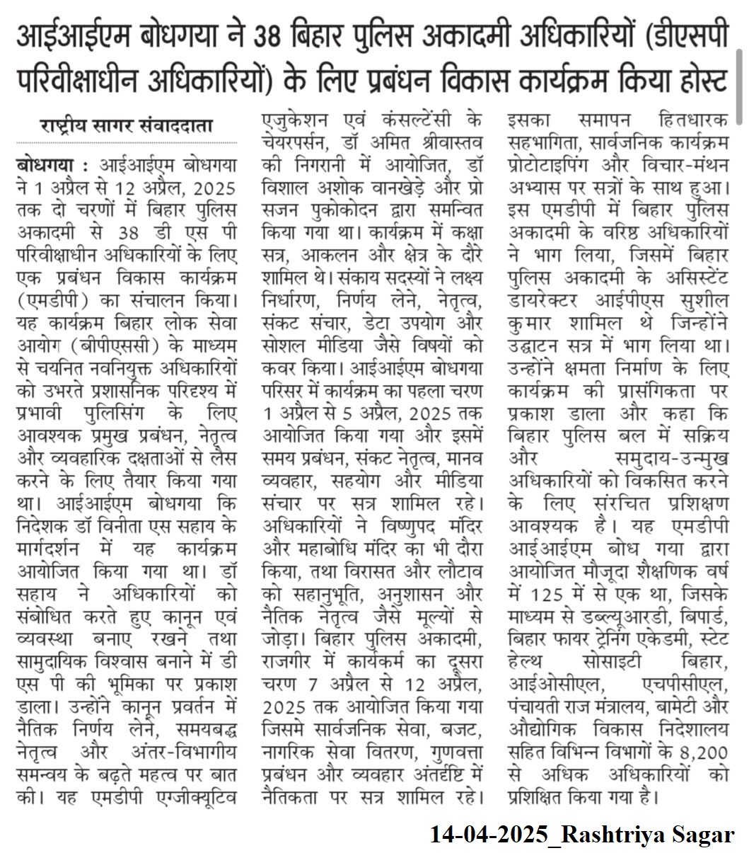Management Development Program, MDP, MDP for Bihar Police Academy Officers (DySPs), Dr. Vinita S. Sahay- Director of IIM Bodh Gaya, Dr. Amit Srivastava- IIM Bodh Gaya, Dr. Vishal Ashok Wankhede, Dr. Sajan Pookkodan- IIM Bodh Gaya, Shri Sushil Kumar- IPS- Bihar Police Academy-Rajgir