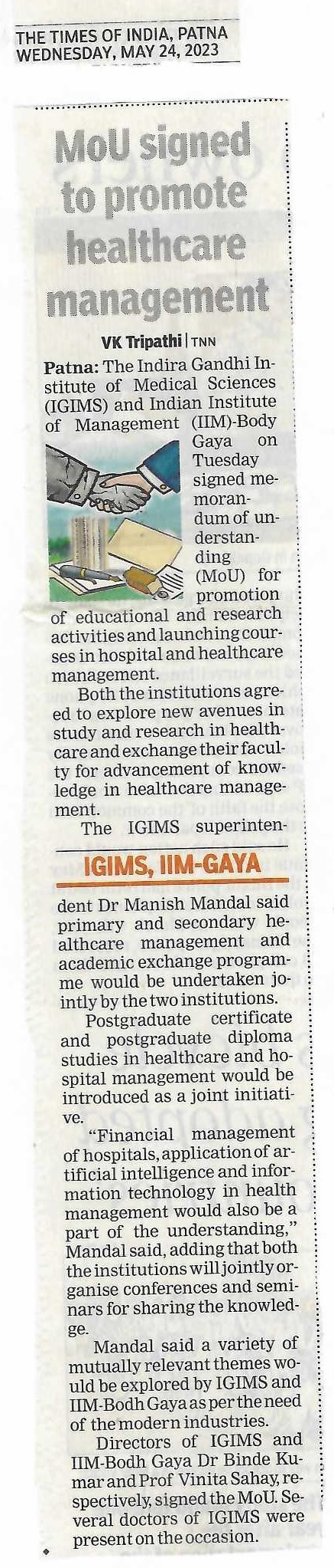Memorandum of Understanding, MoU, Indian Institute of Management (IIM) Bodh Gaya, Dr. Vinita S. Sahay- Director of IIM Bodh Gaya, Indira Gandhi Institute of Medical Science (IGIMS) Patna, Dr. Binde Kumar- Director of IGIMS Patna