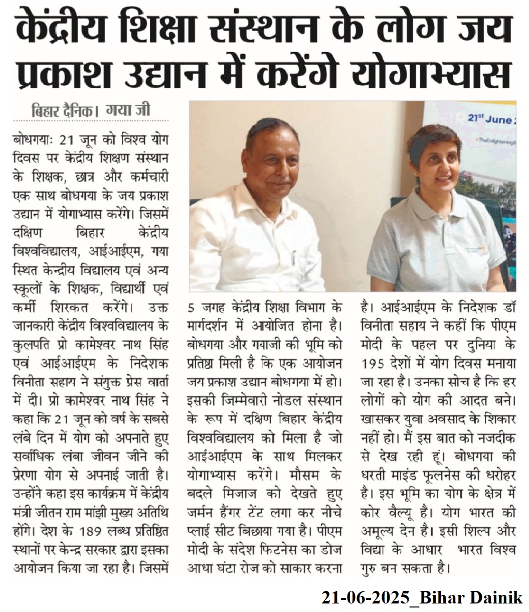 International Yoga Day 2025, Yoga for One Earth- One Health, Indian Institute of Management (IIM) Bodh Gaya, Dr. Vinita S. Sahay- Director of IIM Bodh Gaya, Central University of South Bihar, Dr. Kameshwar Nath Singh- Vice-Chancellor of CUSB, Shri Jitan Ram Manjhi- Union Minister of Micro- Small and Medium Enterprises of India, Jai Prakash Udhyan- Bodh Gaya