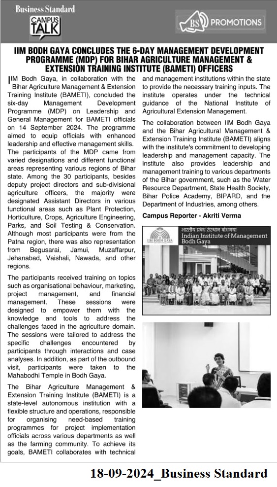 IIM Bodh Gaya concludes the 6-day management development programme (MDP) for Bihar agriculture management & extension training institute (BAMETI) officers