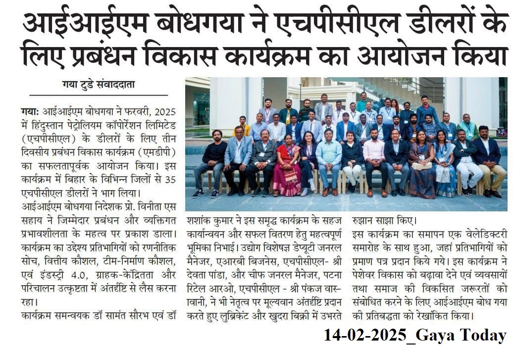 आईआईएम बोधगया ने एचपीसीएल डीलरों के लिए प्रबंधन विकास कार्यक्रम का आयोजन किया