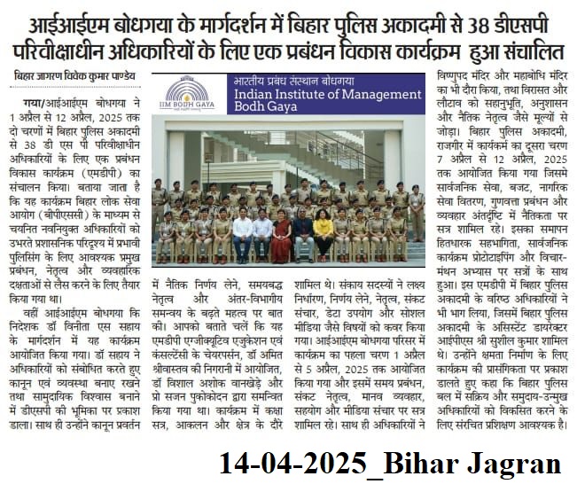आईआईएम बोधगया के मागदर्शन में बिहार पुलिस अकादमी से 38 डीएसपी परिवीक्षाधीन के लिए एक प्रबंधन विकास कार्यक्रम हुआ संचालित