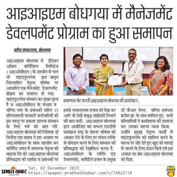 Management Development Program, MDP, Indian Oil Corporation, Mindfulness, Dr. Vinita S. Sahay- Director of IIM Bodh Gaya, Dr. Amit Kumar Srivastava- IIM Bodh Gaya, Dr. Nidhi Mishra- IIM Bodh Gaya