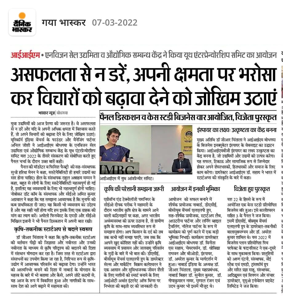 Youth Entrepreneurship Summit, YES 2022, Envision Cell, Sustainability, National Bank for Agriculture and Rural Development (NABARD), Mr. Govinda Rajulu Chintala- Chairman of NABARD, Dr. Vinita S. Sahay- Director of IIM Bodh Gaya, Launched Official Website-INSPIRE