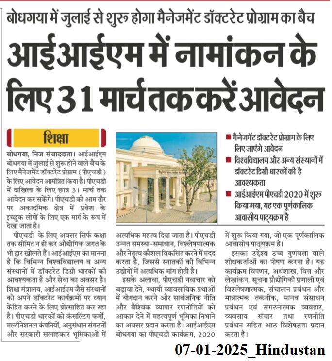 बोधगया में जुलाई से शुरु होगा मैनेजमेंट डाक्टरेट प्रोग्राम प्रोग्राम का बैच: आईआईएम में नामांकन के लिए 31 मार्च तक करें आवेदन