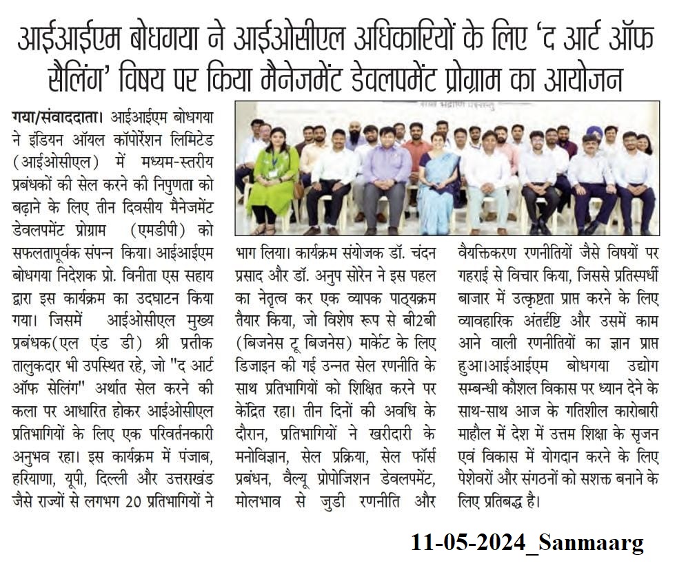 आईआईएम बोधगया ने आईओसीएल अधिकारियों के लिए 'द आर्ट ऑफ सैलिंग' विषय पर किया मैनेजमेंट डेवलपमेंट प्रोग्राम का आयोजन