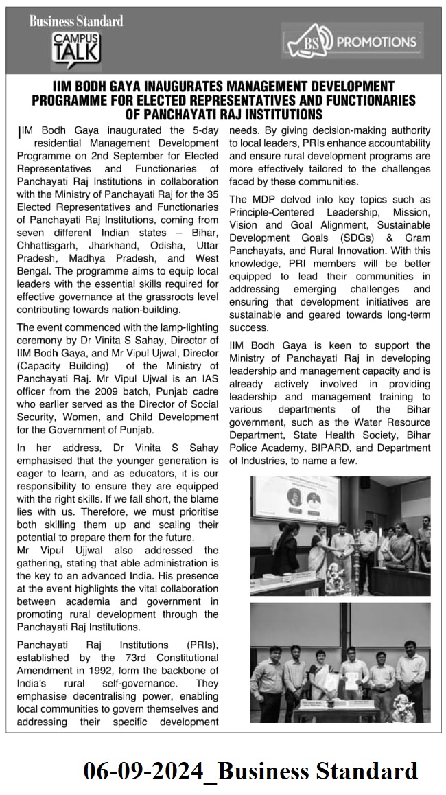 Management Development Program, MDP, Dr. Vinita S. Sahay- Director of IIM Bodh Gaya, Mr. Vipul Ujwal- Director (Capacity Building) of the Ministry of Panchayati Raj, MDP for Elected Representatives and Functionaries of Panchayati Raj Institutions, Panchayati Raj Institutions (PRIs)- Ministry of Panchayati Raj Bihar- Chhattisgarh- Jharkhand- Odisha- Uttar Pradesh- Madhya Pradesh- and West Bengal
