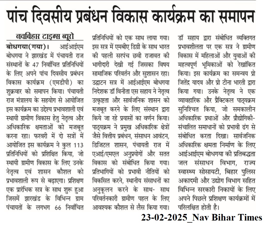 Management Development Program, MDP, MDP for Panchayati Raj Institutions (PRIs) in Jharkhand, Dr. Vinita S. Sahay- Director of IIM Bodh Gaya, Dr. Jitendra Yadav- IIM Bodh Gaya, Dr. Teena Bharti- IIM Bodh Gaya