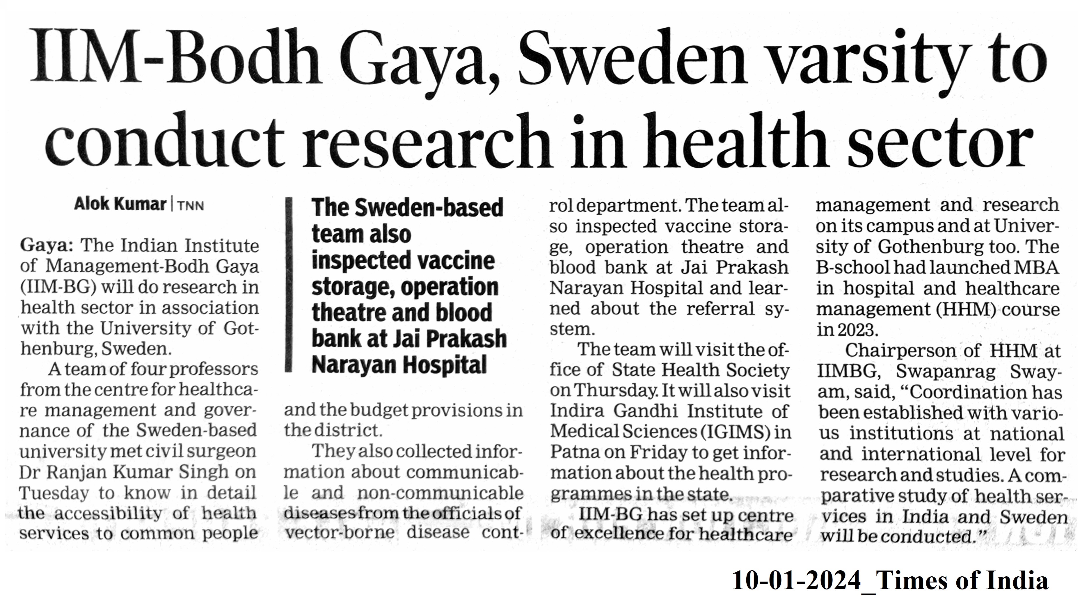 University of Gothenburg- Sweden, Research in Health Sector, Dr Ranjan Kumar Singh, State Health Society, Jai Parakash Narayan Hospital, Indira Gandhi Institute of Medical Sciences (IGIMS)- Patna MBA-HHM, MBA-Hospital and Healthcare Management, Dr. Vinita S. Sahay- Director of IIM Bodh Gaya, Dr. Swapnarag Swain- IIM Bodh Gaya, Research, Health Sector