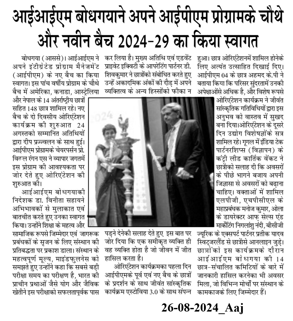 Orientation Programme, Orientation Programme-IPM, Induction Programme, Dr. Vinita S. Sahay- Director of IIM Bodh Gaya, Prof. Vittal Rangan S- IIM Bodh Gaya, Mr. D. Shivakumar- Operating Partner at Advent Private Equity, Mr. Karthik Venkat- Country Lead at India Tech Partnerships (Ads) at Google, Mr. Pratik Yadav- Expert partner at BCG Zurich, Mr. Manoj Kumar- General Manager at LPG- HPCL, Mr. Niglanshu Nandi- Director of Sales and Marketing at OLA
