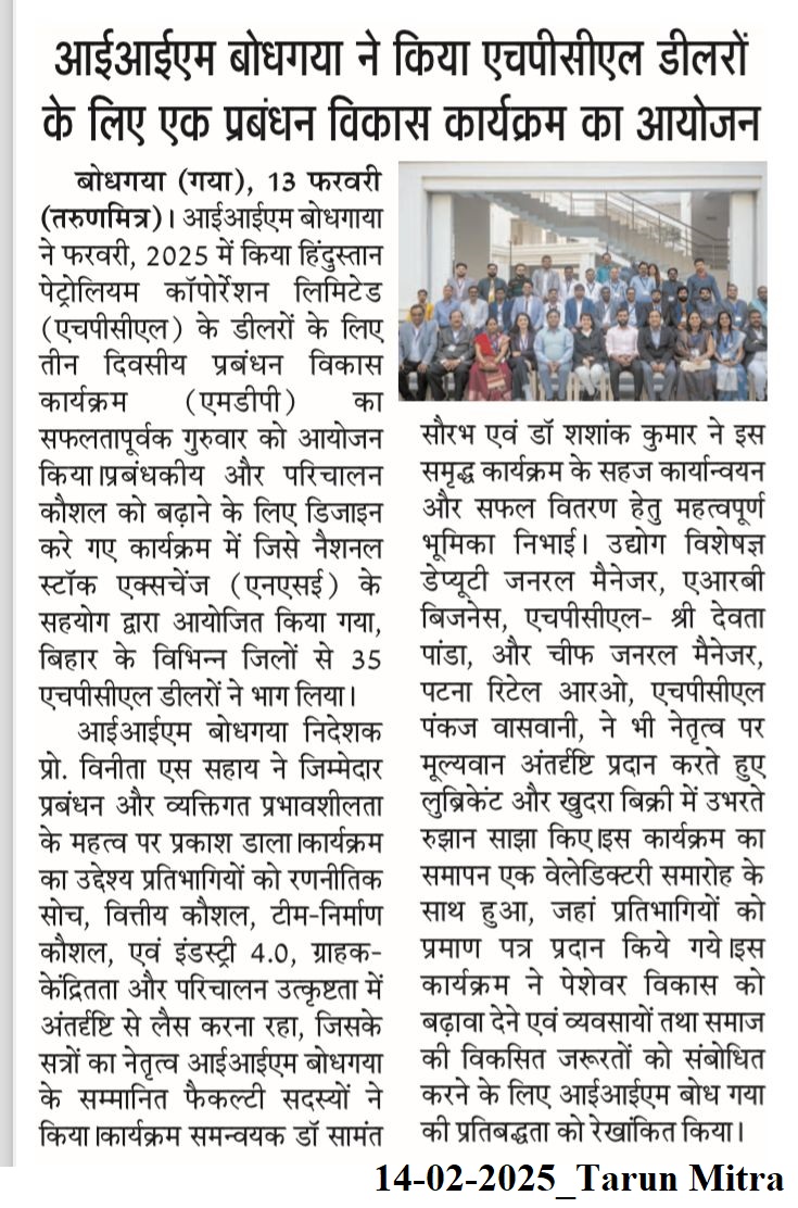 आईआईएम बोधगया ने किया एचपीसीएल डीलरों के लिए एक प्रबंधन विकास कार्यक्रम का आयोजन