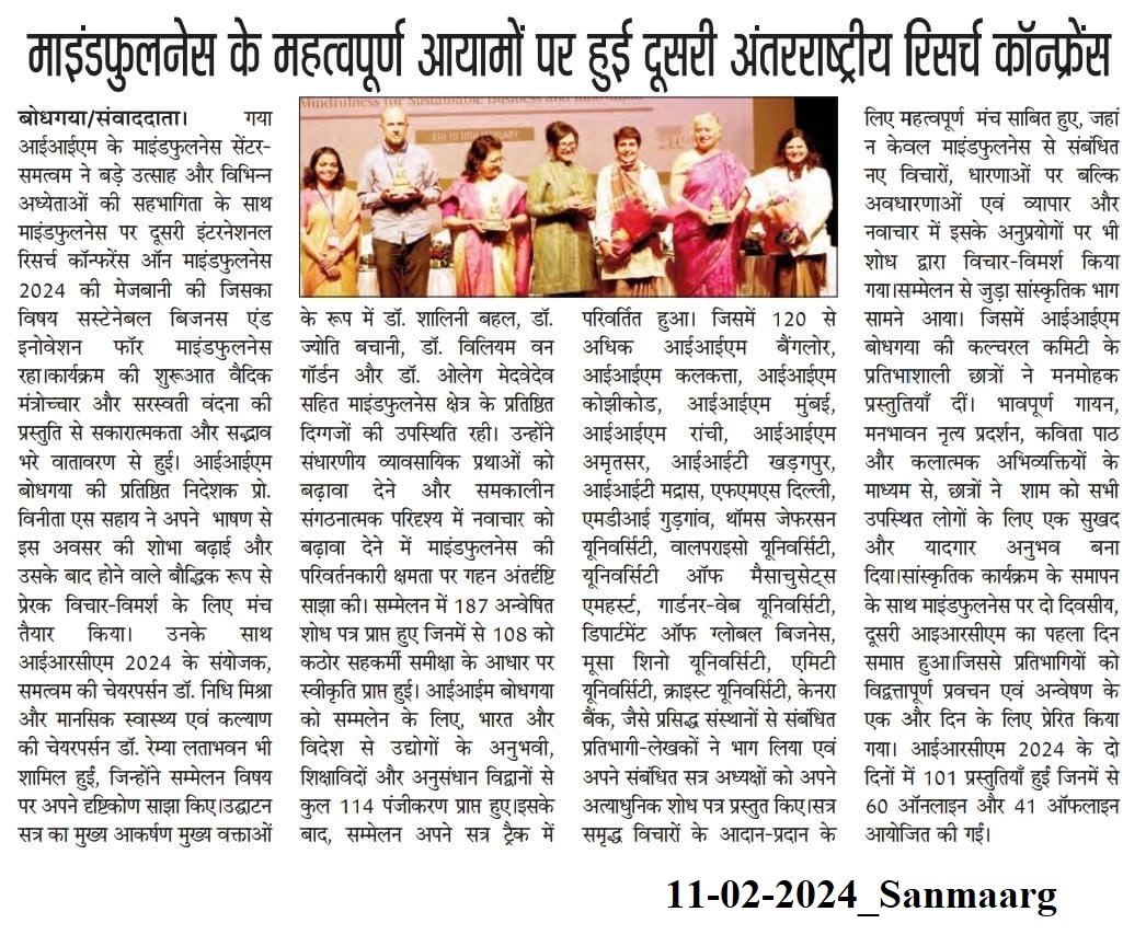 Conference, International Conference, International Research Conference on Mindfulness IRCM 2024, Dr. Vinita S. Sahay- Director of IIM Bodh Gaya, Dr. Nidhi Mishra- IIM Bodh Gaya, Dr. Remya Lathabhavan- IIM Bodh Gaya, Dr. Shalini Bahl, Dr. Jyoti Bachani, Dr. William Van Gordon, Dr. Oleg Medvedev Mindfulness