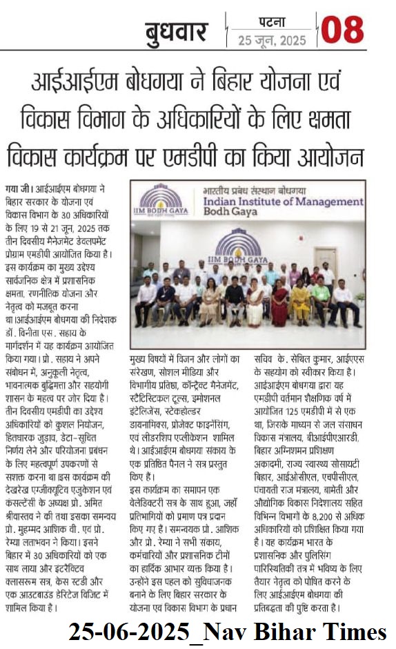 आईआईएम बोधगया ने बिहार योजना एवं विकास विभाग के अधिकारियों के लिए क्षमता विकास कार्यक्रम पर एमडीपी का किया आयोजन