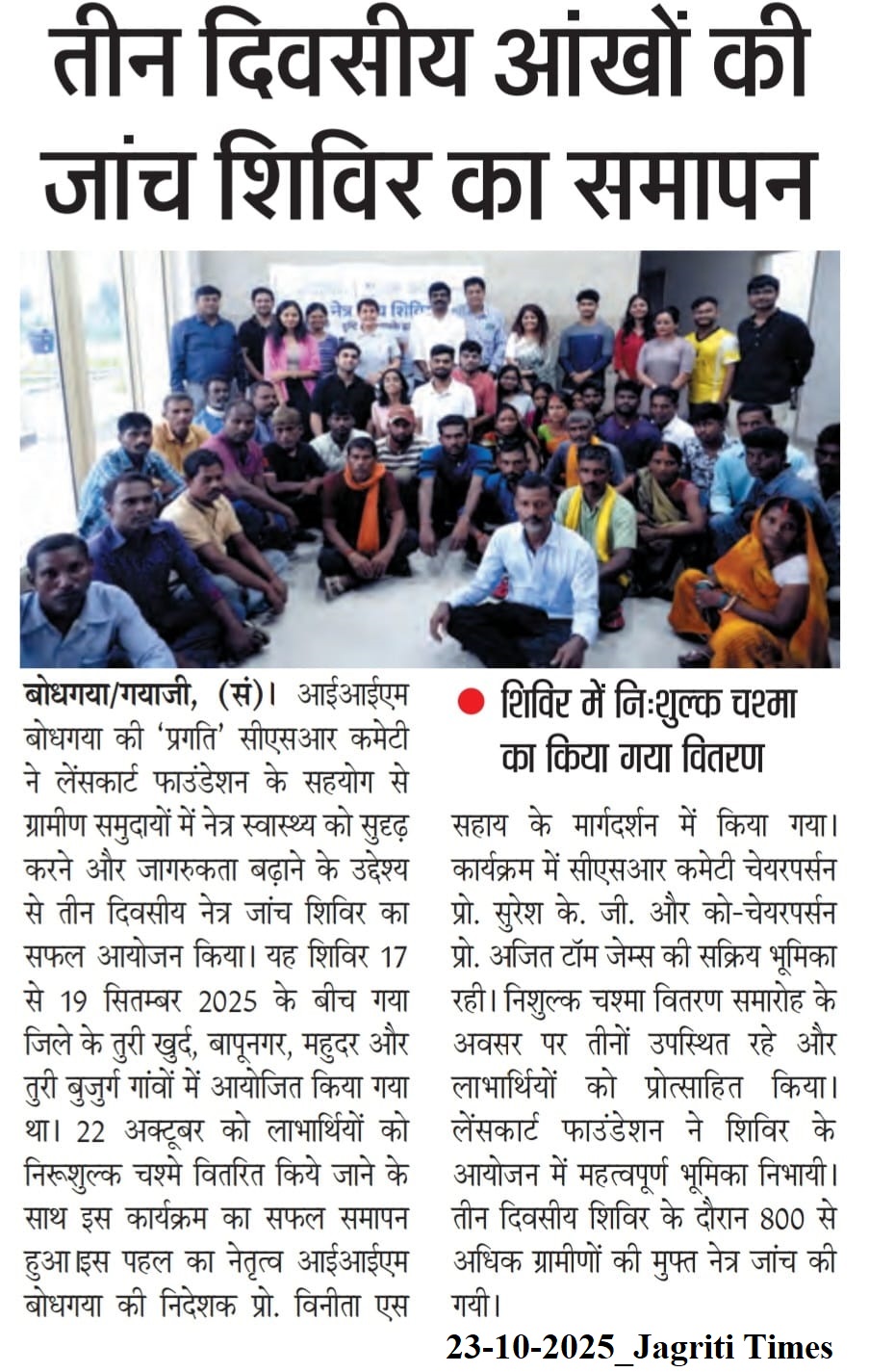 Pragati-CSR Committee, Lenskart Foundation, Free Eye Checkup Camp, Dr. Vinita S. Sahay- Director of IIM Bodh Gaya, Dr. Suresh K G- IIM Bodh Gaya, Dr.Ajith Tom James- IIM Bodh Gaya