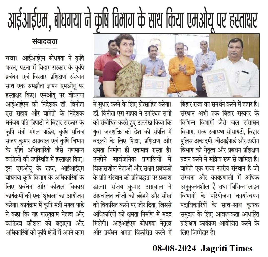 Memorandum of Understanding, MoU, Indian Institute of Management (IIM) Bodh Gaya, Dr. Vinita S. Sahay- Director of IIM Bodh Gaya, Bihar Agriculture Management and Extension Training Institute (BAMETI), Shri Dhananjay Pati Tripathi- Director of BAMETI, Shri Mangal Pandey, Shri Sanjay Kumar Agrawal, Management Development Program, MDP, Management and Skill Development Program for Agriculture Department Officials