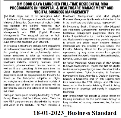 IIM Bodh Gaya launched full-time residential MBA programmes in 'Hospital & Healthcare Management' and 'Digital Business Management'