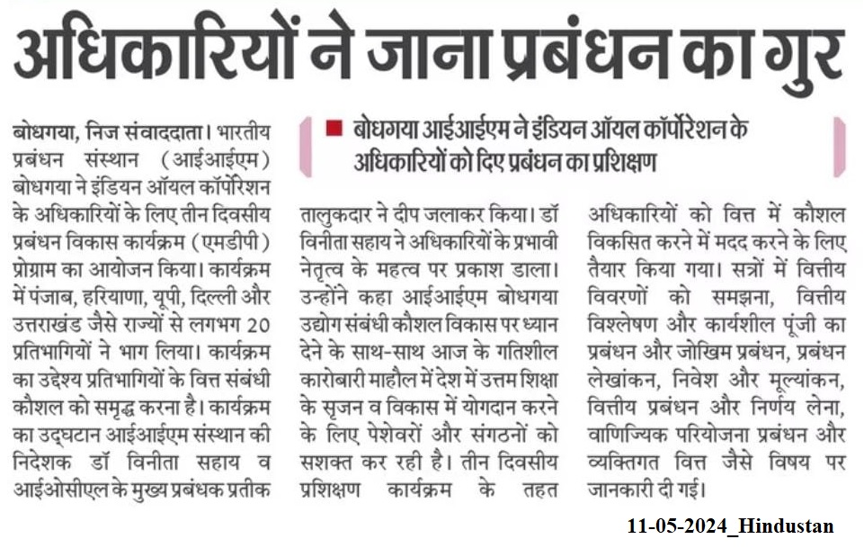 Management Development Program, MDP, Indian Oil Corporation Limited (IOCL), The Art of Selling, Dr. Vinita S. Sahay- Director of IIM Bodh Gaya, Mr. Pratik Talukdar- Chief Manager (L&D) at IOCL, Dr. Chandan Prasad- IIM Bodh Gaya, Dr. Anup Anurag Soren- IIM Bodh Gaya