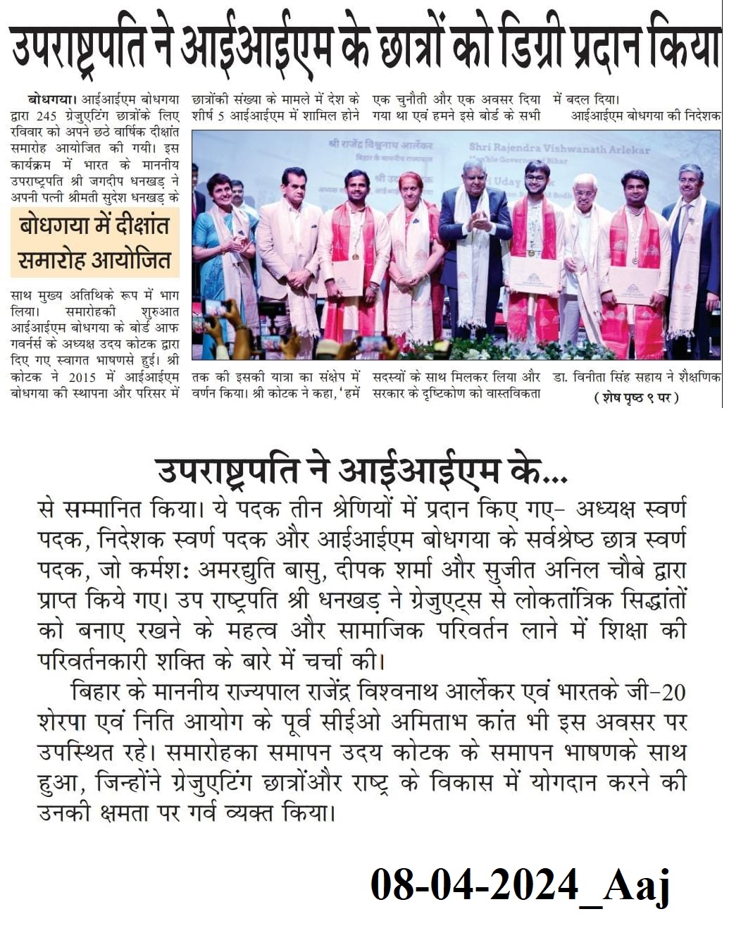 Convocation, 6th Annual Convocation, Convocation 2024, Jagdeep Dhankhar- Vice President of India, Rajendra Arlekar- Governor of Bihar, Shri Uday Kotak- Chairperson- IIM Bodh Gaya, Dr. Vinita S. Sahay- Director of IIM Bodh Gaya