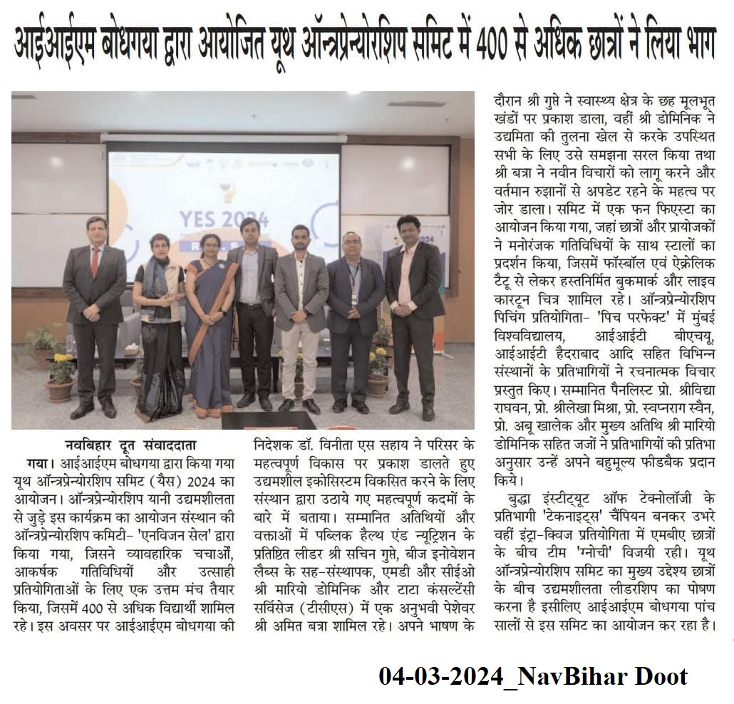 Youth Entrepreneurship Summit, YES 2024, Envision Cell, Entrepreneurship and Industrial Relations Cell, Startup, Entrepreneurship, Dr. Vinita S. Sahay- Director of IIM Bodh Gaya, National Bank for Agriculture and Rural Development (NABARD), Shri Sachin Gupte, Mario Dominic