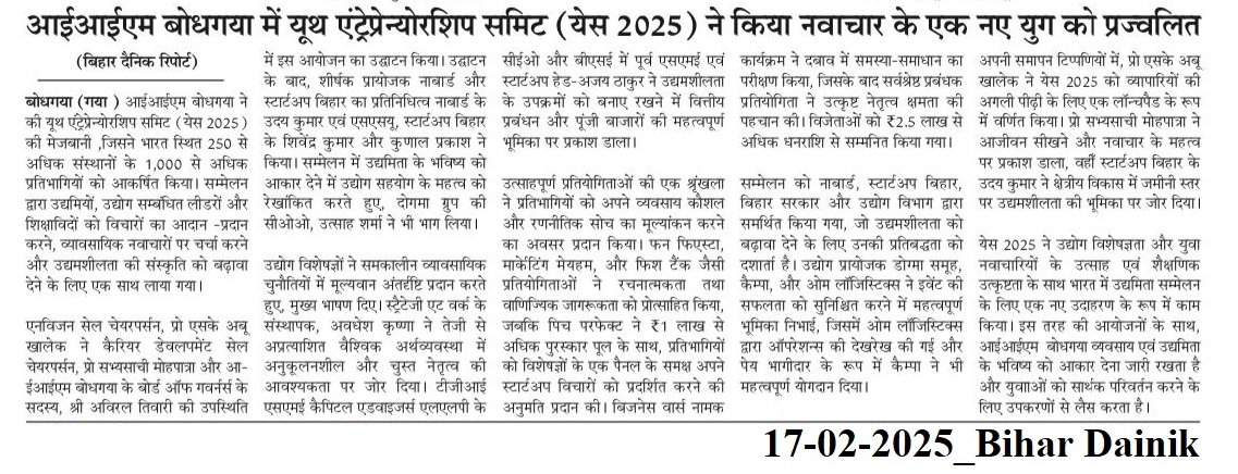 आईआईएम बोधगया में युथ एंट्रेप्रेन्योरशिप समिट (येस 2025) ने किया नवाचार के एक नए युग को प्रज्वलित