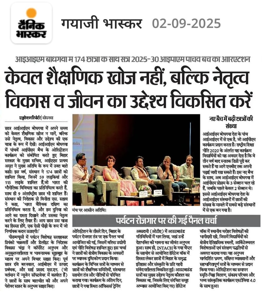 Integrated Programme in Management, IPM Programme-Fifth Batch-2025-30, Orientation Programme-IPM, Induction Programme-IPM, Policy and Governance Awareness, Dr. Vinita S. Sahay- Director of IIM Bodh Gaya, Mr. Pratyay Amrit- Chief Secretary of Government of Bihar, Mr. Priyank Chakravarty- Public Policy Expert / Advisor, Mr. Vikash Chandra- Director of Deloitte, Mr. Ravi Barnwal- Alumnus of IIM Bodh Gaya, Mr. Suresh Prasad- Corporate Professional