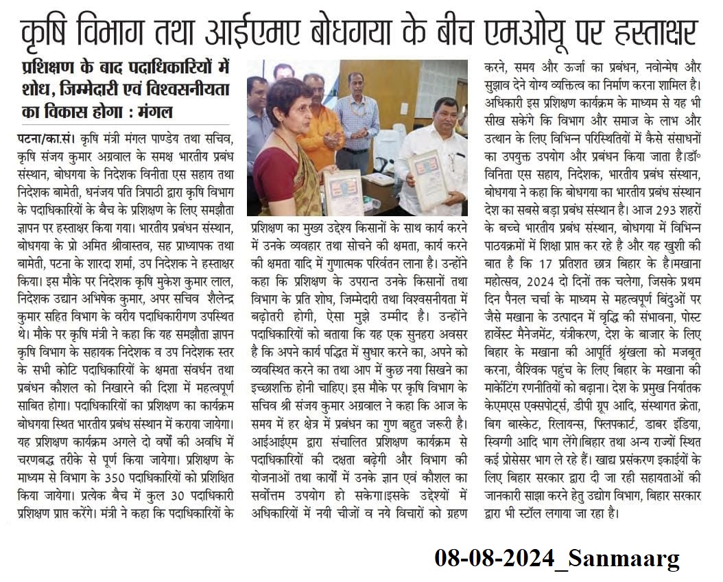 Memorandum of Understanding, MoU, Indian Institute of Management (IIM) Bodh Gaya, Dr. Vinita S. Sahay- Director of IIM Bodh Gaya, Bihar Agriculture Management and Extension Training Institute (BAMETI), Shri Dhananjay Pati Tripathi- Director of BAMETI, Shri Mangal Pandey, Shri Sanjay Kumar Agrawal, Management Development Program, MDP, Management and Skill Development Program for Agriculture Department Officials