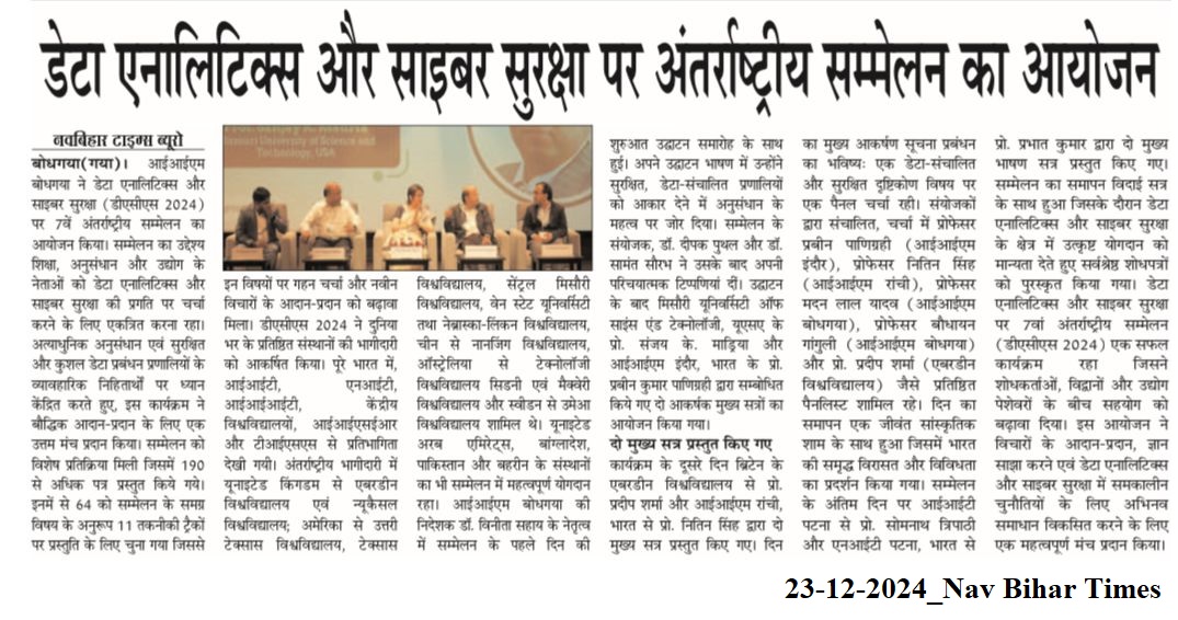 International Conference, International Conference on Data Analytics and Cyber Security, DACS 2024, Dr. Vinita S. Sahay- Director of IIM Bodh Gaya, Prof. Pradeep Sharma- University of Aberdeen- UK, Prof. Nitin Singh- IIM Ranchi, Prof. Panigrahi- IIM Indore, Dr. Madan Lal Yadav- IIM Bodh Gaya, Dr. Baudhayan Ganguly- IIM Bodh Gaya, Prof. Somnath Tripathi- IIT Patna, Prof. Prabhat Kumar- NIT Patna