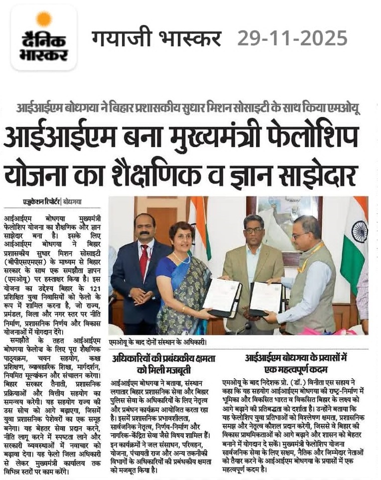 Memorandum of Understanding, MoU, Indian Institute of Management Bodh Gaya, Dr. Vinita S. Sahay- Director of IIM Bodh Gaya, Bihar Prashasnik Sudhar Mission Society- Govt. of Bihar, Chief Minister's Fellowship Scheme (CMFS)- Govt. of Bihar, Viksit Bharat Viksit Bihar
