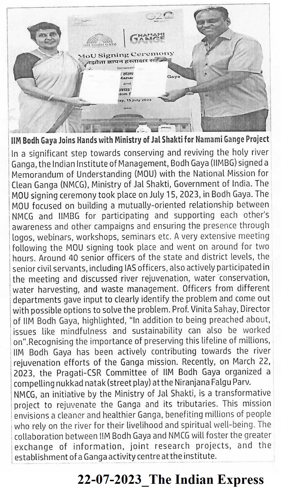 Memorandum of Understanding, MoU, Indian Institute of Management Bodh Gaya, Dr. Vinita S. Sahay- Director of IIM Bodh Gaya, Ministry of Jal Shakti- Govt. of India, Mr. G. Asok Kumar- Director General (NMCG), National Mission for Clean Ganga (NMCG), Namami Gange, IIM Bodh Gaya, IIMBG