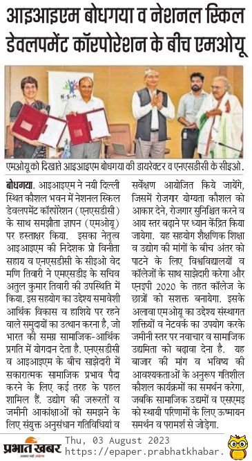आइआइएम बोधगया व नेशनल स्किल डेवलपमेंट कॉरपोरेशन के बीच एमओयू