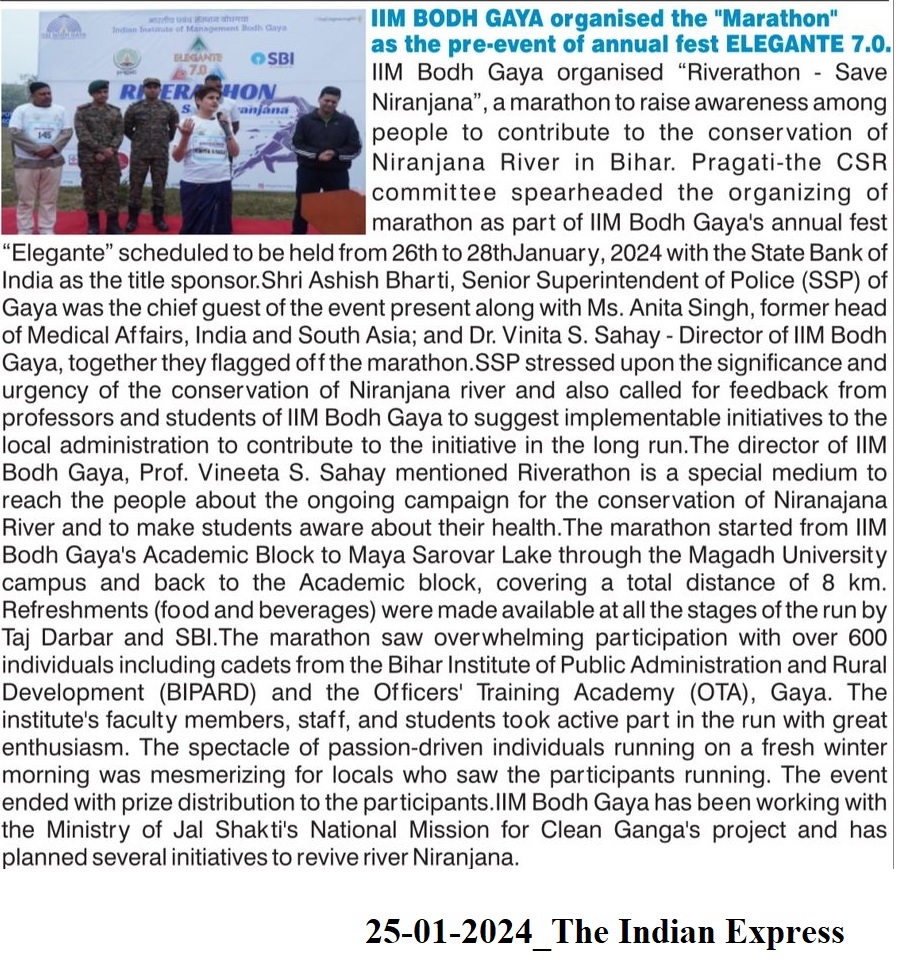 Marathon Race, Riverathon-Save Niranjana, Annual Fest, Elegante, Elegante 7.0, Shri Ashish Bharti- Senior Superintendent of Police (SSP) Gaya, Dr. Vinita S. Sahay- Director of IIM Bodh Gaya