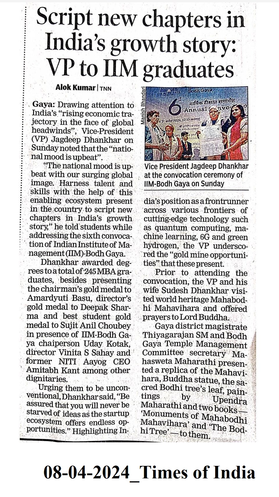 Convocation, 6th Annual Convocation, Convocation 2024, Jagdeep Dhankhar- Vice President of India, Rajendra Arlekar- Governor of Bihar, Shri Uday Kotak- Chairperson- IIM Bodh Gaya, Dr. Vinita S. Sahay- Director of IIM Bodh Gaya