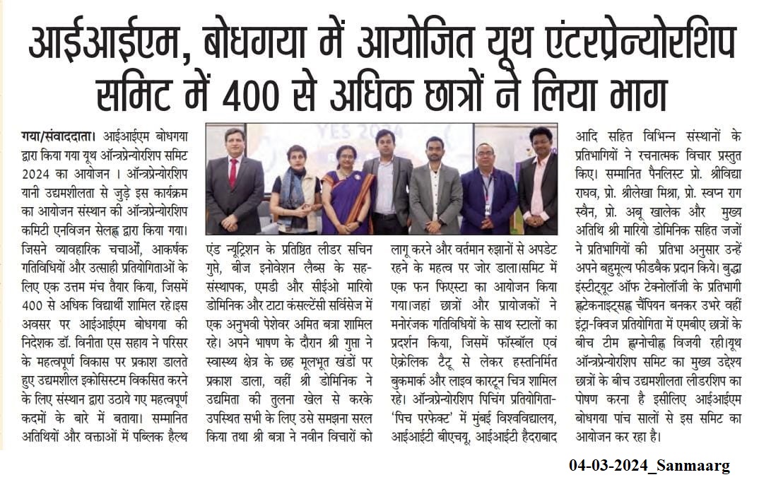 आईआईएम, बोधगया में आयोजित युथ एंटरप्रेन्योरशिप समिट में 400 से अधिक छात्रों ने लिया भाग