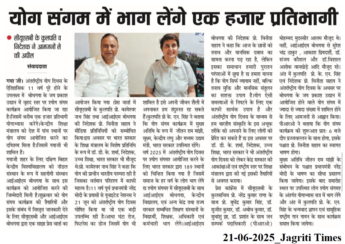 International Yoga Day 2025, Yoga for One Earth- One Health, Indian Institute of Management (IIM) Bodh Gaya, Dr. Vinita S. Sahay- Director of IIM Bodh Gaya, Central University of South Bihar, Dr. Kameshwar Nath Singh- Vice-Chancellor of CUSB, Shri Jitan Ram Manjhi- Union Minister of Micro- Small and Medium Enterprises of India, Jai Prakash Udhyan- Bodh Gaya