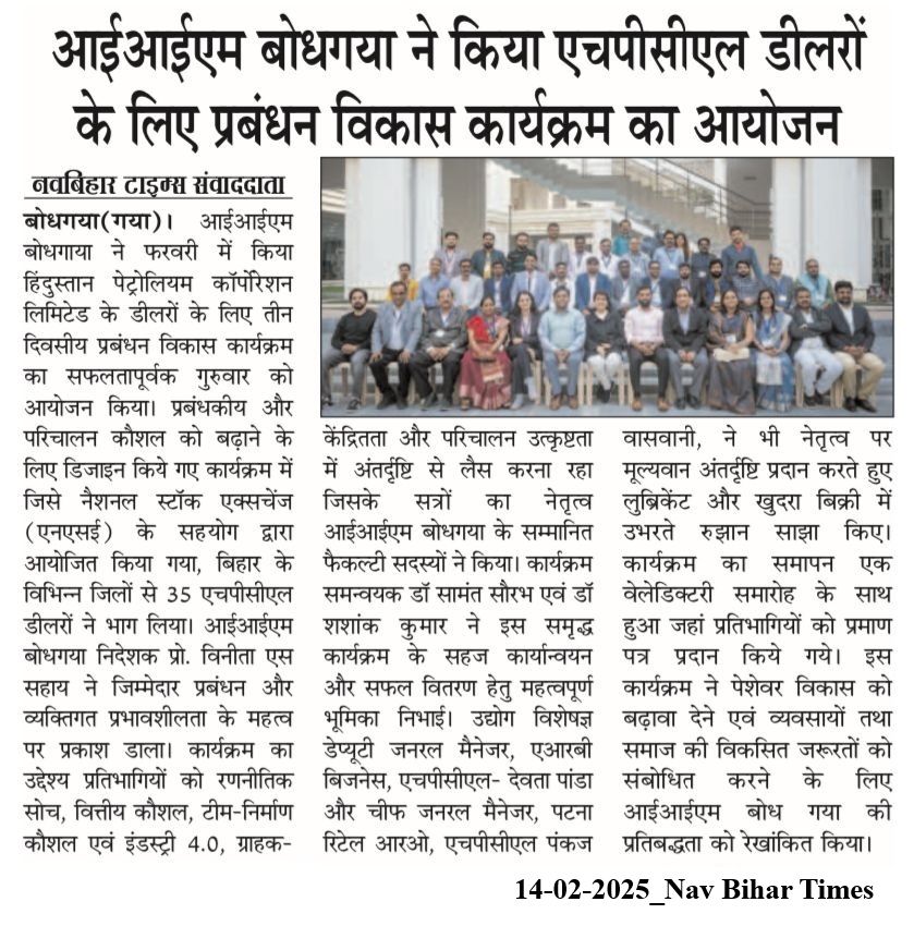 आईआईएम बोधगया ने किया एचपीसीएल डीलरों के लिए प्रबंधन विकास कार्यक्रम का आयोजन