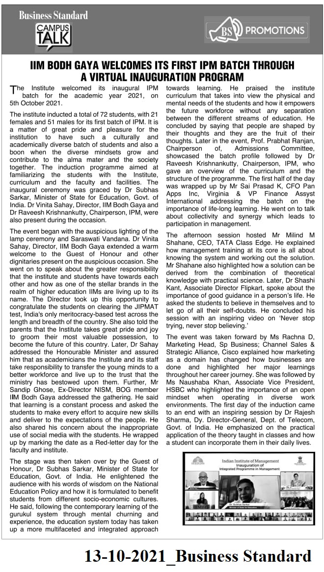 IIM Bodh Gaya welcomes its first IPM batch through a virtual inauguration program