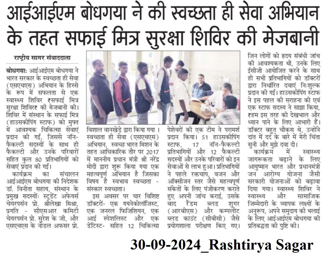 Safai Mitra Suraksha Shivir, Swachhata Hi Seva (SHS) Campaign, Swachh Bharat Mission (SBM), Pragati–CSR Committee, Swabhav Swachhata–Sanskaar Swachhata, Health Camp, Dr. Vinita S. Sahay-Director of IIM Bodh Gaya, Dr. Sreelekha Mishra- IIM Bodh Gaya, Dr. Suresh K G- IIM Bodh Gaya, Dr. Vishal Wankhede, IIM Bodh Gaya