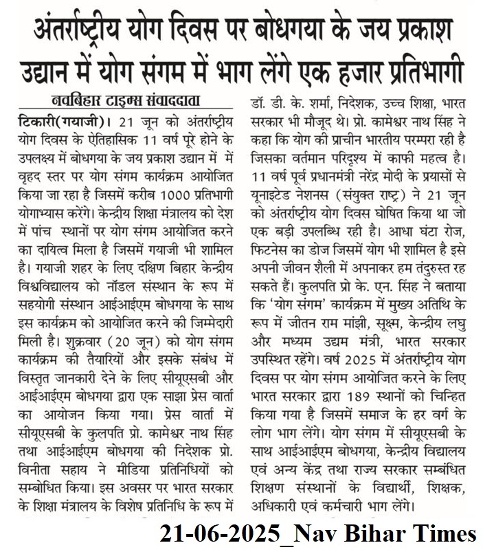 International Yoga Day 2025, Yoga for One Earth- One Health, Indian Institute of Management (IIM) Bodh Gaya, Dr. Vinita S. Sahay- Director of IIM Bodh Gaya, Central University of South Bihar, Dr. Kameshwar Nath Singh- Vice-Chancellor of CUSB, Shri Jitan Ram Manjhi- Union Minister of Micro- Small and Medium Enterprises of India, Jai Prakash Udhyan- Bodh Gaya
