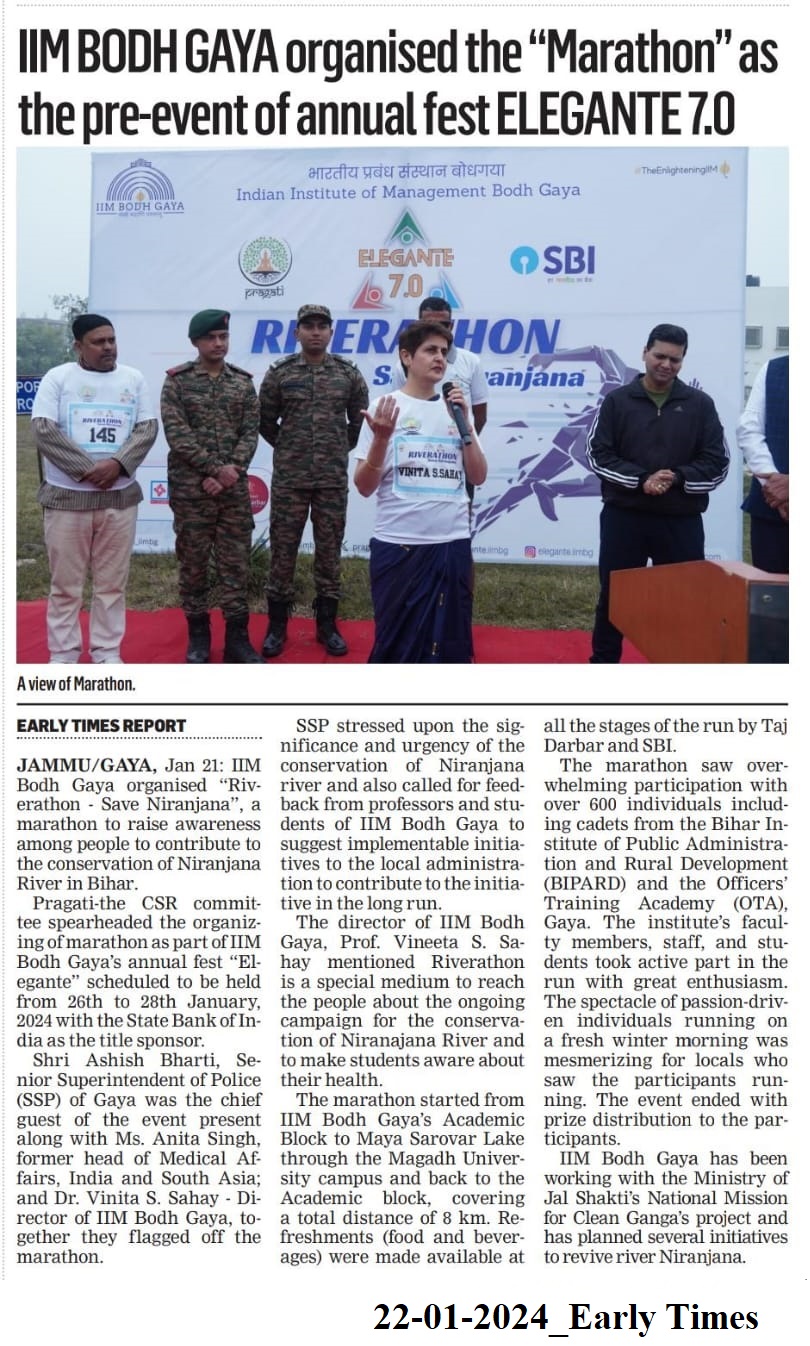 Marathon Race, Riverathon-Save Niranjana, Annual Fest, Elegante, Elegante 7.0, Shri Ashish Bharti- Senior Superintendent of Police (SSP) Gaya, Dr. Vinita S. Sahay- Director of IIM Bodh Gaya